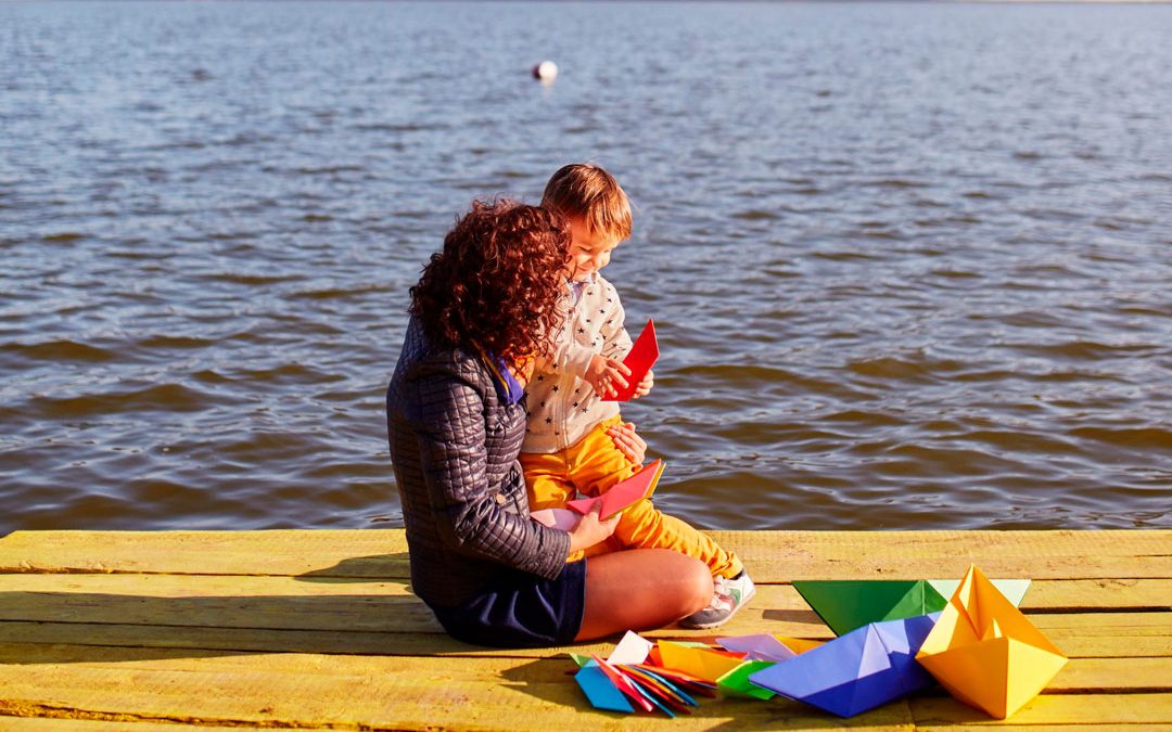 mom-son-playing-with-paper-boats-by-lake-scaled